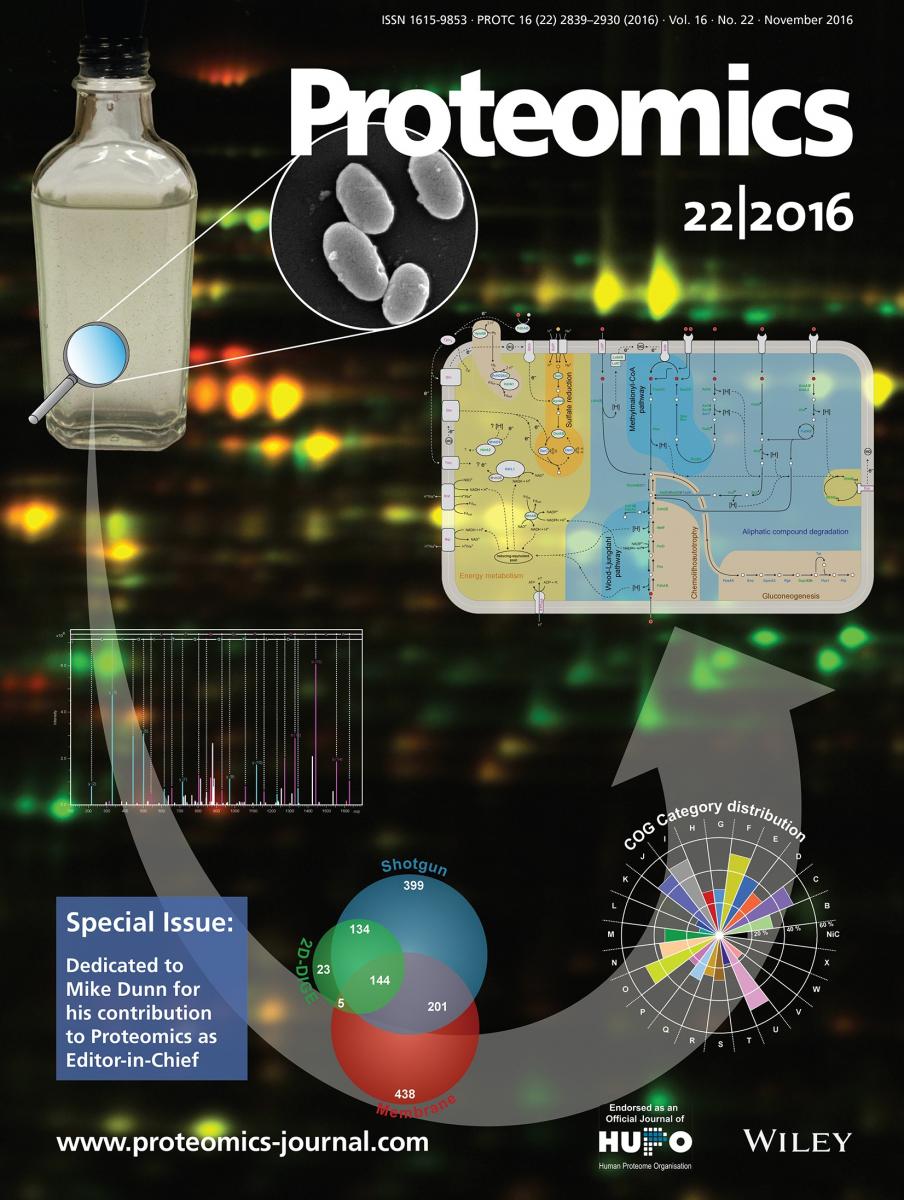 1) The cover image illustrates how proteomics bridges classical microbiology with a systems biology level understanding of metabolic networks. The backgound is a 2D‐DIGE image - Marvin Dörries et al. , page 2878.