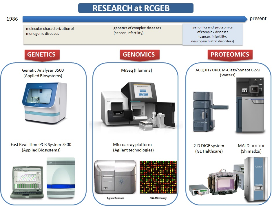 The proteomics research in the RCGEB is focused on protein expression profiling of complex diseases/conditions such as cancer, male infertility and neuropsychiatric disorders. The main aim of this research is elucidation of the disease mechanisms through whole proteome comparison of diseased and healthy tissues and search for non-invasive screening/diagnostic biomarkers through proteomics analysis of body fluids. The Department for Proteomics uses 2-D DIGE/MALDI-TOF and label-free shotgun profiling with nano-LC-MS/MS to perform these comparisons.