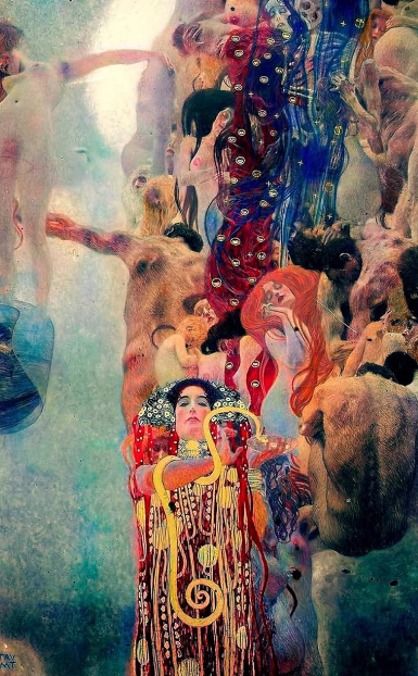 'Medicine' was painted by Gustav Klimt in March 1901 on the ceiling of University of Vienna. At the bottom of the painting stood Hygieia with the Aesculapian snake around her arm, turning her back to mankind. Klimt conveyed the role of medicine and healing but was told that he had ignored doctors' two main achievements, - prevention and cure!